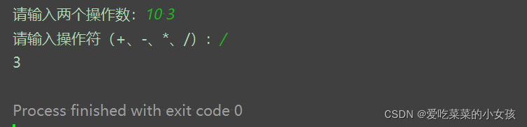 该博客介绍了一个Python程序,它接受用户输入的两个整数和一个运算符(+、-、*、/),并根据运算符计算结果。当使用除法时,程序返回整除结果,如10/3等于3。如果除数为0,则显示'Error!'。文章提供了程序代码,并展示了运行结果。