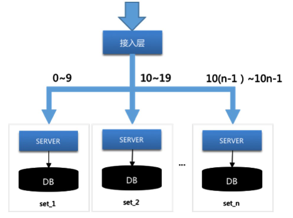 红包系统根据这个红包 ID,按一定的规则(如按 ID 尾号取模等),垂直上下切分。切分后,一个垂直链条上的逻辑 Server 服务器、DB 统称为一个 SET。