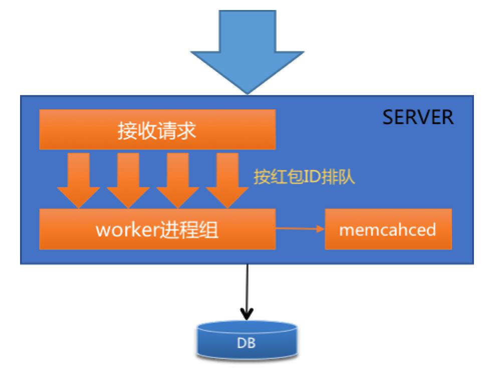 将 stick 到同一台 Server 上的所有请求在被接收进程接收后,按红包 ID 进行排队。然后串行地进入 worker 进程(执行业务逻辑)进行处理,从而达到排队的效果,如下图所示。