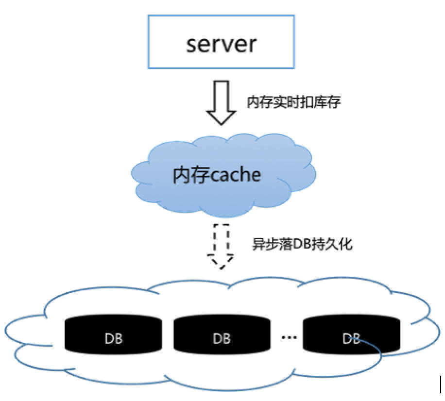 如图 2 所示,将“实时扣库存”的行为上移到内存 Cache 中操作,内存 Cache 操作成功直接给 Server 返回成功,然后异步落 DB 持久化。