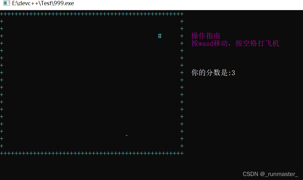 具体思路:我们可以通过按键改变飞机的位置,只要用两个for循环来重复检测这架飞机的位置,一旦for循环中的所对应的点与目标重合,打印即可,一直重复这个操作就能给我们带来了飞机在移动的动画效果.
