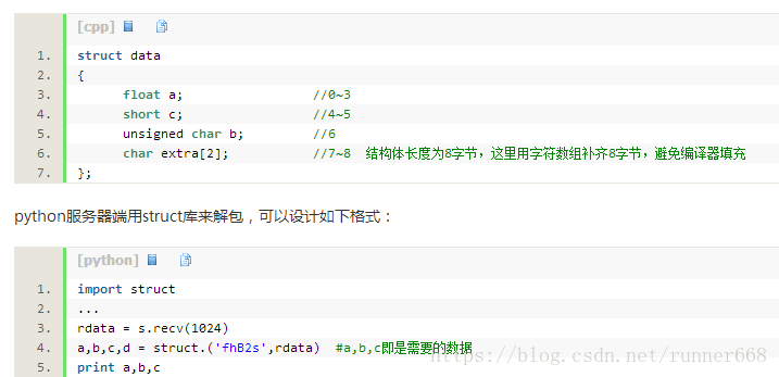 如果熟悉结构体中数据对齐的规则,可以合理设计结构体的结构,各成员变量的顺序,使得所有的数据成员存放在连续的存储区,而且结构体的长度等于所有成员长度之和(可以适当在尾部用字符数组补齐,避免编译器自动填充),这样就方便用send函数发送了。( 如果服务器和客户端都是用C/C++开发,两端可以通过同样结构的结构体来封包和解包,可以不考虑数据对齐的问题)下面讨论的是在C++和python开发的两端之间传输数据的情况:客户端用的C++编写,服务器端用python编写,相对于C++中用struct来封包和解包,python提供了struct库实现类似的功能,最重要的三个函数是pack,unpack,calcsize,struct库处理二进制数据的具体用法可以参考这篇文章:http://www.cnblogs.com/gala/archive/2011/09/22/2184801.html。在python下用socket接收到的字节流实际上是字符串,需要对所有的字节进行指定解析格式,所以在C++发送的时候就要避免发送不确定的数据(如编译器自动填充的数据),如果用struct组织数据就需要考虑数据对齐的问题了。下面用一个实例来说明:在C++客户端有1个a(float) ,1个b(unsigned char),一个c(short) 要发送给服务器端,在不使用#pragma指令指定编译器的对齐位数时, 在我的编译器环境下默认为4,可以这样设计结构体:
