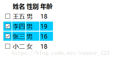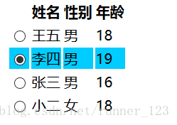 $("tr:contains("王五")).addClass("selected");(2)单选框控制表格高亮