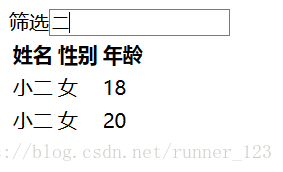 <tr><th>姓名</th><th>性别</th><th>年龄</th></tr>