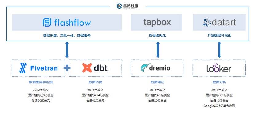 跑象科技成立一年多以来,团队研发了flashflow、tapbox、datart三款全新核心产品。其中datart作为最受欢迎的国产开源数据可视化平台Davinci的升级产品,依然坚持以全开源的方式在社区运营。在海外,实时数据技术和数据整合工具的赛道也在蓬勃发展,例如2012年-2016年,以Fivetran和dbt为代表的厂商开启了自动化数仓集成和数据构建转换服务模式,为用户提供“开箱即用”的实时数据应用工具,其中2012年创立的Fivetran已完成D轮融资,市值达56亿美元。