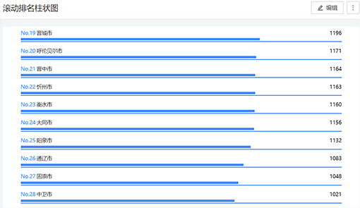 折线区域图- 箱线图- 子弹图- 轮播条形图- 分组表- 多维条形图- 可下钻地图- 多维柱状图- 扩展组件路径图- 世界地图- 热力图- 水球图- 带背景色的柱状图- 立体柱状图- 极坐标条形图- 进度条- 基础雷达图- 轨迹图- 半圆玫瑰图- 旭日图- 矩形树图- 左右对比条形图
