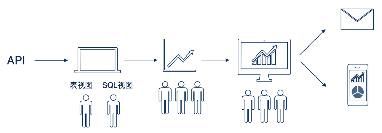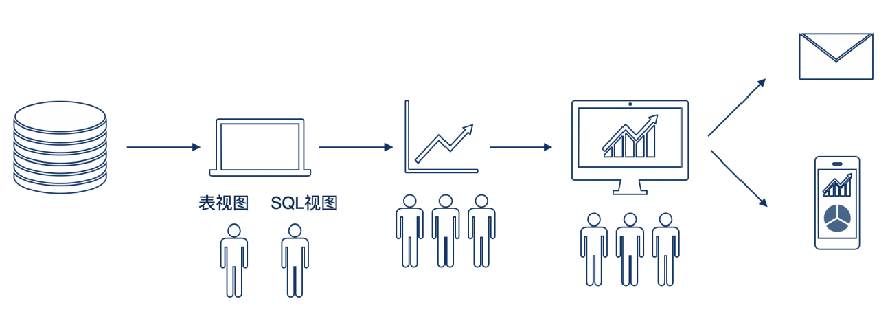 通过数据视图加工 >> 自助分析 >> 制作仪表板 >> 定时任务发送邮件 / 分享链接到决策人,以上步骤产出报表;是最典型的使用场景。