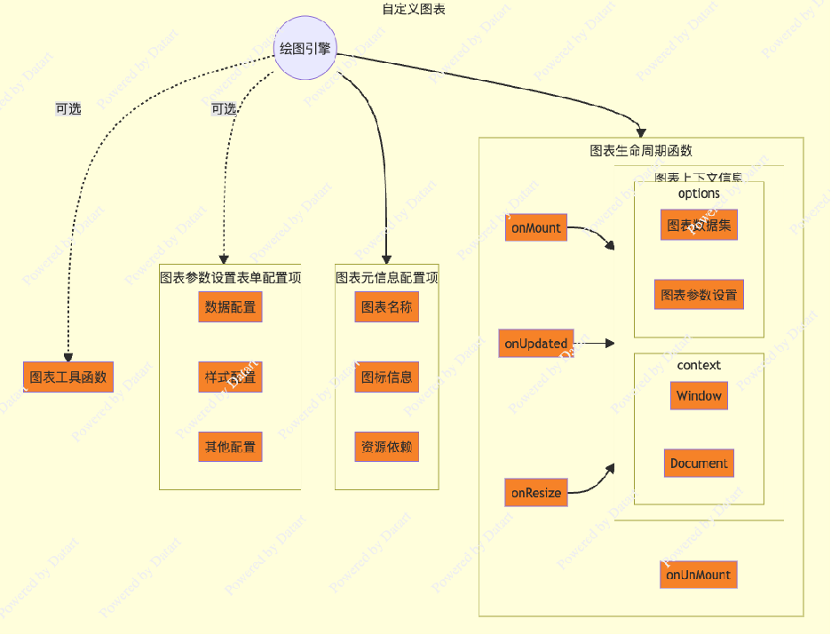 插件机制提供了标准的输入接口,使得开发用户可以灵活适配不同的 Web 绘图引擎(如 D3、echarts 等),通过定义图表元信息、配置参数、生命周期函数来自由构建满足业务需求的图表。高度简化了定制化开发周期。