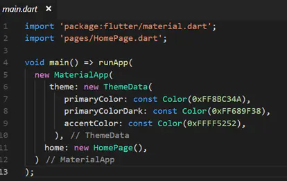 main.dart是整个应用的入口,这里通过runApp来创建一个MaterialApp,主界面由HomePage实现。