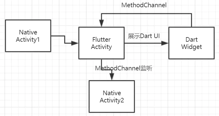 Native界面在用户触发某个操作时进入Flutter主界面,并展示Dart编写的Widget。Dart Widget通过MethodChannel和FlutterActivity通信,然后再由FlutterActivity启动Native界面。这样就完成了Native和Flutter的混合编程。