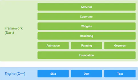 Flutter架构包括Framework和Engine两部分,Framework部分采用Dart语言编写,包括组件、渲染器等;Engine部分由C++实现,完成了平台无关性的操作。