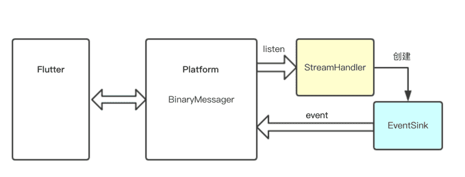 StreamHandler与前两者稍显不同,用于事件流的通信,最为常见的用途就是Platform端向Flutter端发送事件消息。当我们实现一个StreamHandler时,需要实现其onListen和onCancel方法。而在onListen方法的入参中,有一个EventSink(其在Android是一个对象,iOS端则是一个block)。我们持有EventSink后,即可通过EventSink向Flutter端发送事件消息。