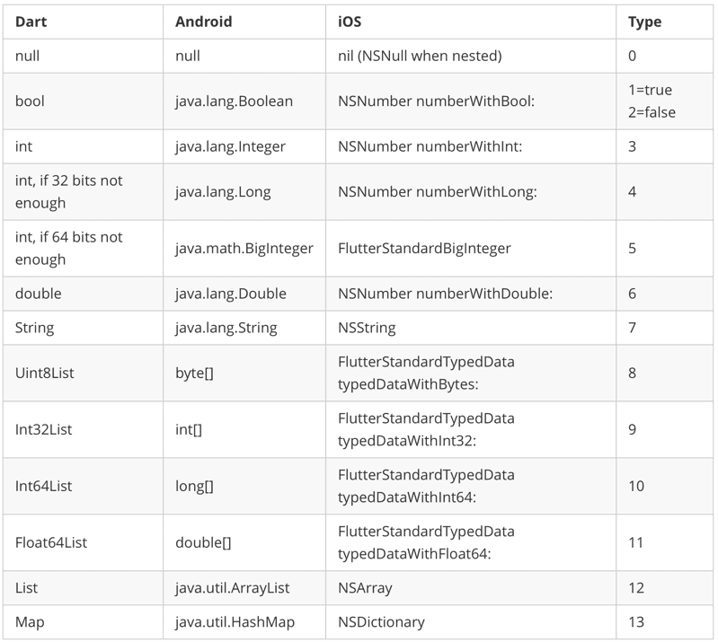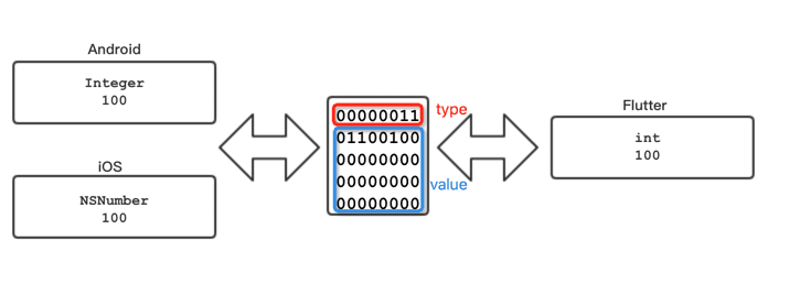 所以在上文提到的例子中,java.lang.Integer或NSNumber类型的返回值先是被序列化成了一段二进制格式的数据,然后该数据传递到传递到flutter侧后,被反序列化成了dart语言中的int类型的数据。