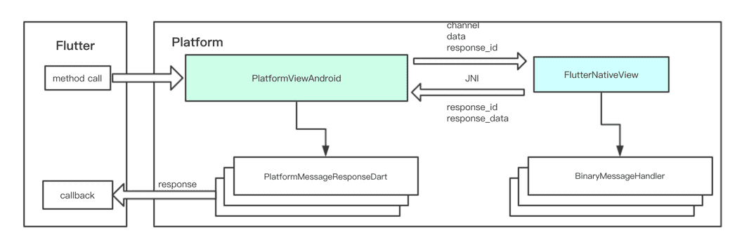 PlatformViewAndroid的是Platformview的子类,也是其在Android端的具体实现。当PlatformViewAndroid接收到PlatformMessage类型的消息时,如果消息中有response(类型为PlatformMessageResponseDart),则生成一个自增长的response_id,并以response_id为key,response为value存入字典pending_responses_中。接着,将channel和data均转化为Java可识别的数据,通过JNI向Java层发起调用,将response_id、channel和data传递过去。