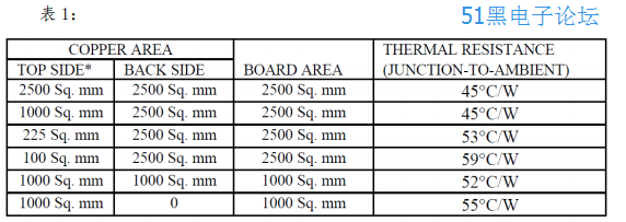 从节到环境的总体热阻可以低至 45°C/W;这需要一个合理尺寸的 PC(印刷电路)板,至少有一层铜将热量分散在板上,并将其耦合到周围空气中。实验表明,散热铜层没有必要电气连接到器件的 TAB 端。在焊盘区域、附着到设备的焊盘和内部或反面的地层之间,PC 板的材质在传递热量方面十分有效。尽管 PC 材质实际的热导很高,但是各层之间热导的 Length/Area 却很小。表 1中的数据,是用 1 盎司 1/16 英寸厚的 FR-4 板子测得的(译者注:PCB 中用盎司来表示铜箔厚度,1 盎司约为 35.34um;FR-4 是一种耐燃材料等级的代号),并且可以用来当作评估热阻的严格的指导原则。