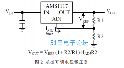 AMS1117 系列开发了一个在输出端和调整端(ADJ)之间 1.25V 的参考电压,在这两个端之间放置电阻,电流将持续流过电阻 R1 并向下流过 R2,从而设定总的输出电压;这个持续电流的大小一般指指定的最小负载电流 10Ma。因为电流Iadj 微弱而恒定,所以可以当成一个误差,通常情况下可以忽略。