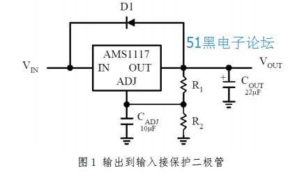 和以前的稳压器不同,该 AMS1117 系列不需要在调整(ADJ)引脚和输出引脚之间、输出到输入之间添加保护二极管来防止芯片过压。AMS1117 的内部电阻限制了内部电流流经调整引脚(ADJ),因此,调整引脚(ADJ)接了电容之后,甚至在短路情况下都不需要添加保护二极管来保证器件的安全性了。输入和输出之间通常不需要保护二极管。器件内部输出引脚到输入引脚之间的二极管能够处理 50A-100A 的微秒浪涌电流。正常运行时,即使接入了较大值的输出电容,也很难获取到浪涌电流的数值。如果在输出端使用了 1000UF 到5000UF 等高容值的输出电容,输入引脚突然短接到地时,有可能会对器件造成损坏。当在 AMS1117 的输入端带有撬棒电路(crowbar circuit)时,建议从输出到输入之间接一个保护二极管,如图 1 所示。