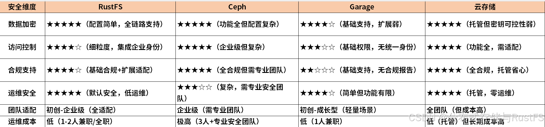 不用再纠结多方案泛对比,一张表看清RustFS的安全优势与团队适配性: