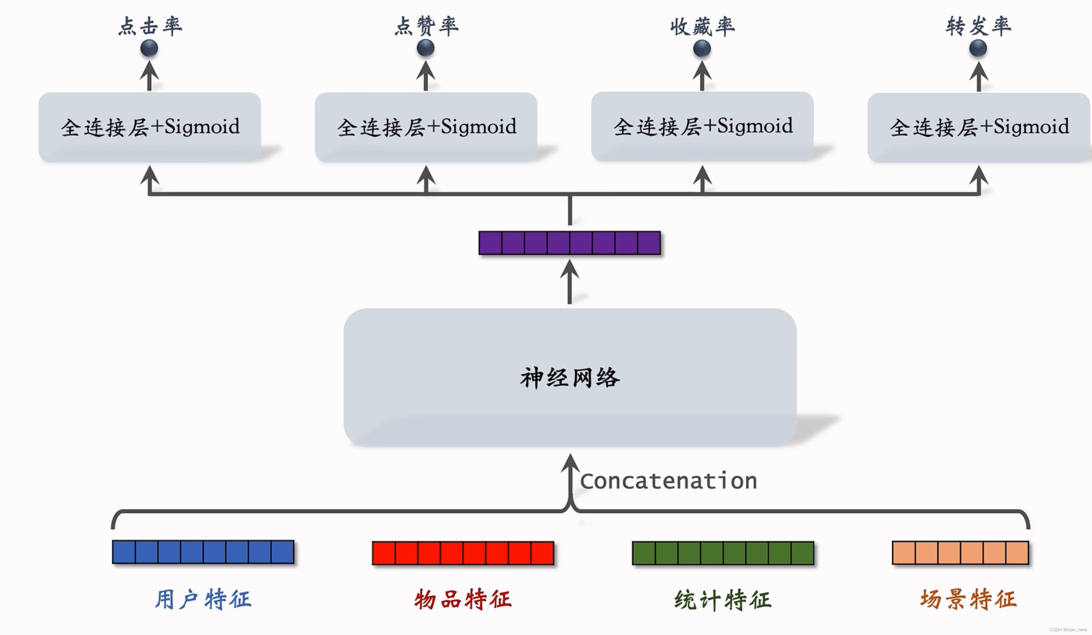 排序模型预估点击率、点赞率、收藏率、转发率的分数,最后进行分数融合,做排序和截断