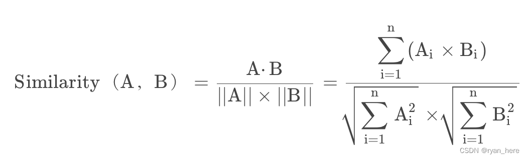 余弦相似度(Cosine Similarity)是n维空间中两个n维向量之间角度的余弦。它等于两个向量的点积(向量积)除以两个向量长度(或大小)的乘积。