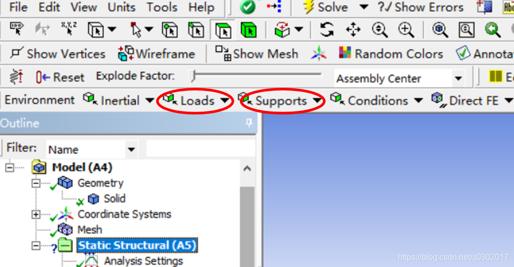 6.施加载荷和约束,单击Static Structural.选中Support下的Fixed Support,选择需要施加固定约束的面,点击Apply。