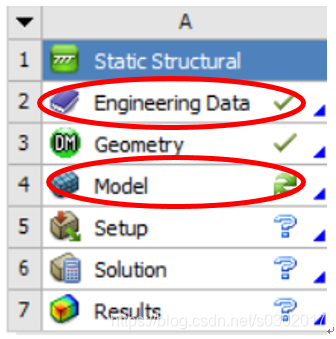 4.关闭DesignModeler回到Workbench主界面,在Enginerring Data中选择材料,此处不做具体说明。双击model打开Mechanical主截面,添加刚才定义的材料。