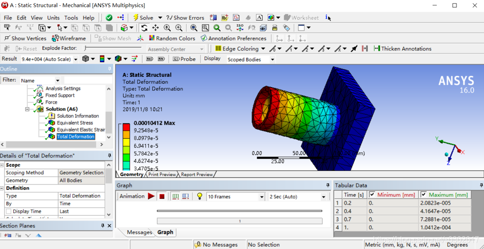 插入应力、应变、变形图等。点solution,添加Stress中的Equivalent Stress(等效应力)、Strain中的Equivalent(Von-Mises)(等效应变)、Deformation中的Toal(总变形),就可以得到模拟的结果了。下图分别是得到的应力、应变和变形云图及相关信息。