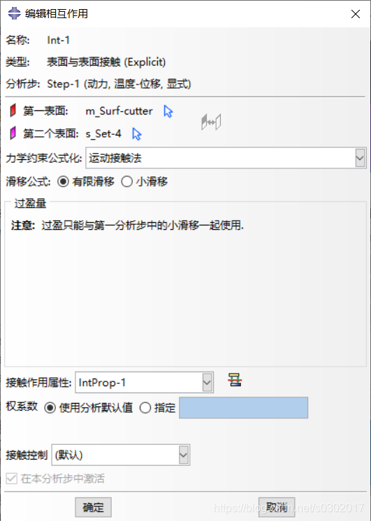 选择刀具和岩石相互作用的表面,设置接触。切向行为,摩擦公式设为罚,系数为0.2;设置法相行为;设置热传导系数为10000/0.0001;设置生热为默认值。