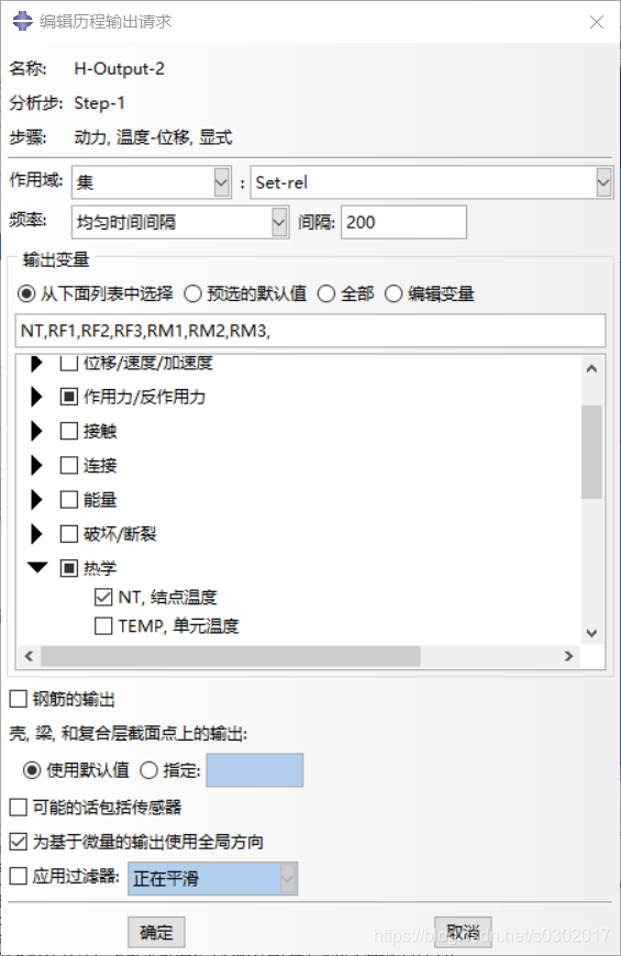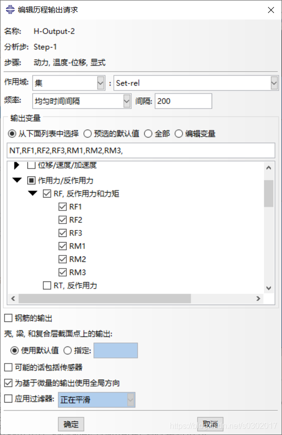 时间长度设置为0.01。场输出请求勾选STATUS和作用力与反作用力。历程输出请求勾选作用力/反作用力下的RF,反作用力和扭矩,以及热学下的NT,结点温度。如图所示