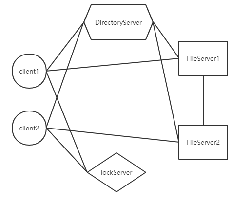 本次服务可以同时运行一个目录服务器,一个锁服务器和多个客户端及文件服务器,简单绘制系统结构图如下: