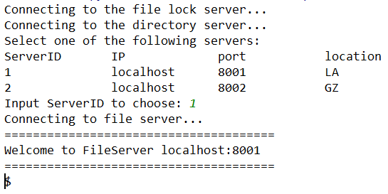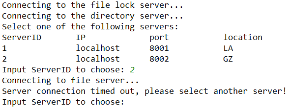 在客户端连接目录服务器后,会先进入选择文件服务器阶段。目录服务器发送所有文件服务器的信息,包括 ip 地址和端口号,客户端选择后就会直接和对应的文件服务器相连: