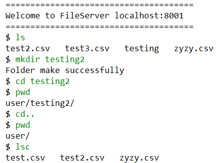操作依次为列出目录文件、创建文件夹,进入文件夹,输出当前路径,返回上一级,输出当前路径,输出客户端本地文件列表。