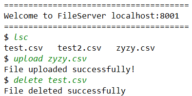 接着使用客户端 1 连接文件服务器 1 后先上传一个 zyzy.csv 的文件,之后将 test3.csv 从服务器中删除,查看文件服务器 2 是否发生了对应更改: