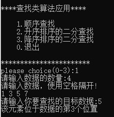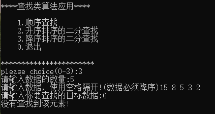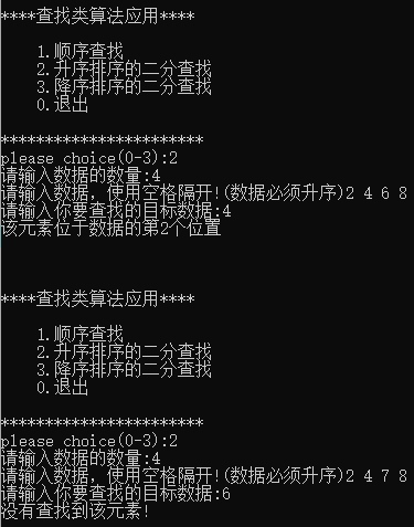 此次设计要求在用户输入数组时必须有顺序必须时升序,或者是降序,如果用户不符合输入规定很有可能查找不到用户输入的数据。