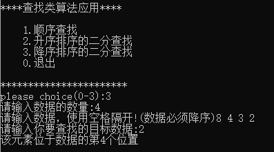 设计思路:先提示用户输入数据,此时用户的输入顺序必须时降序的,然后提示用户输入目标元素。程序上整体上与升序数组二分查找元素相似,使用head指向用户输入的第一个元素,tail指向最后一个元素。Mid=(head+tail)/2,当下标为mid的元素==用户输入的元素,返回下标程序退出,当下标为mid的元素>=用户输入的元素,head=mid+1,继续下一轮循环。当下标为mid的元素<=用户输入的元素,tail=mid-1,继续下一轮循环.直到找到元素的位置,或者head>tail时程序退出。