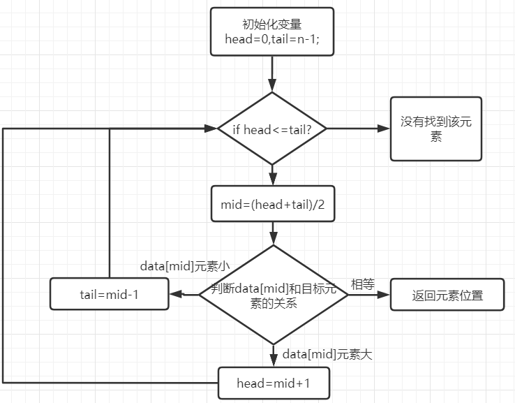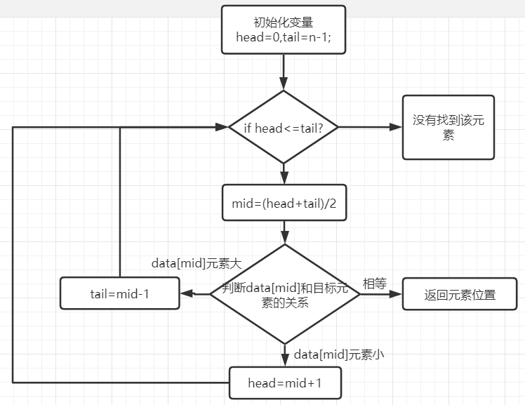 设计思路:先提示用户输入数据,此时用户的输入顺序必须时升序的,然后提示用户输入目标元素。使用head指向用户输入的第一个元素,tail指向最后一个元素。Mid=(head+tail)/2,当下标为mid的元素==用户输入的元素,返回下标程序退出,当下标为mid的元素>=用户输入的元素,tail=mid-1,继续下一轮循环。当下标为mid的元素<=用户输入的元素,head=mid+1,继续下一轮循环.直到找到元素的位置,或者head>tail时程序退出。