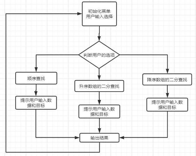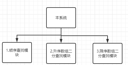 根据功能分析,建立系统的体系结构,即将整个系统分解为3个模块,分成三个模块,分别是顺序查找模块,升序数组的二分查找模块,降序数组的二分查找模块。
