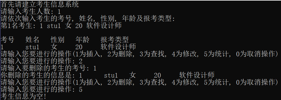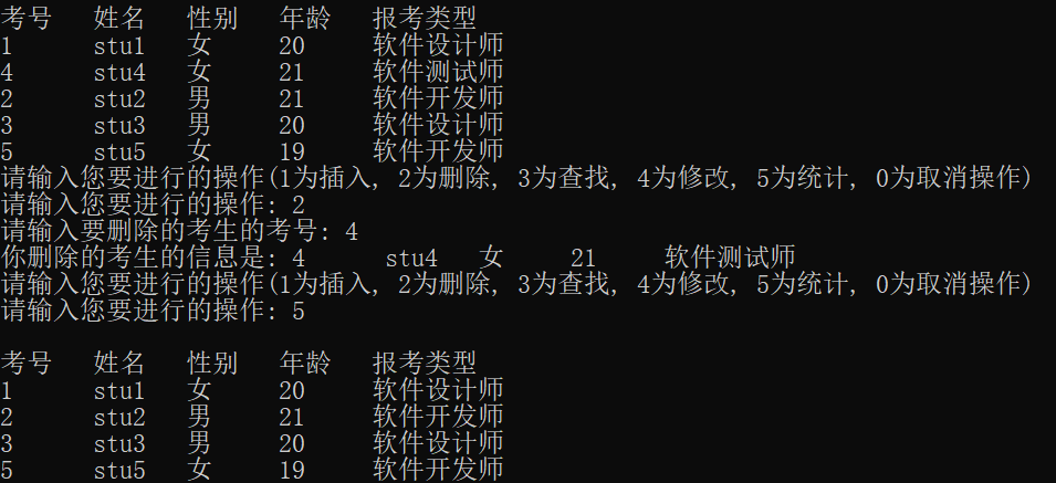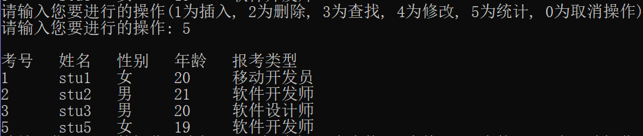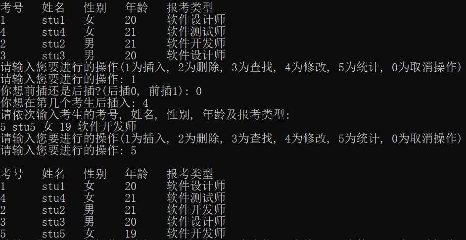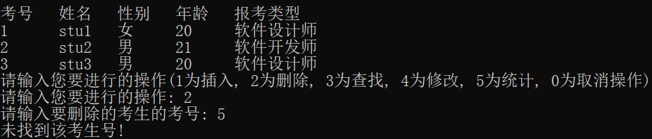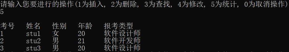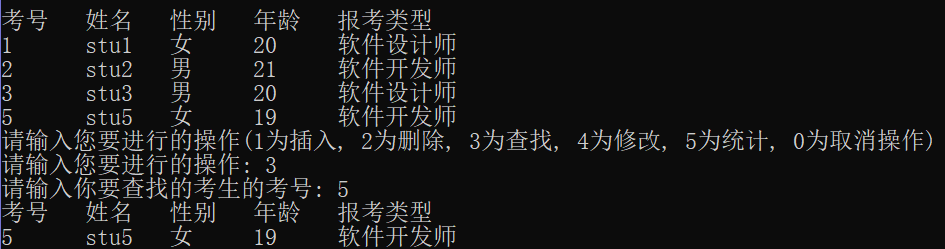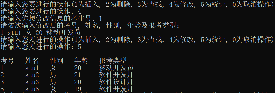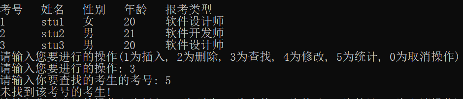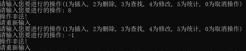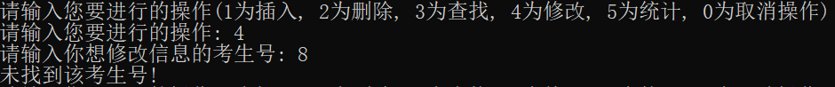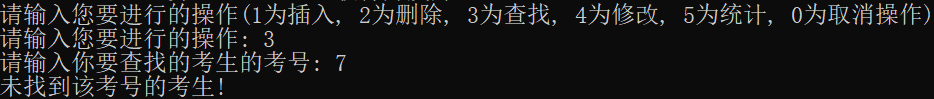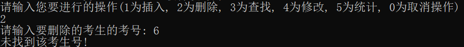 printf("请输入您要进行的操作(1为插入, 2为删除, 3为查找, 4为修改, 5为统计, 0为取消操作)\n");