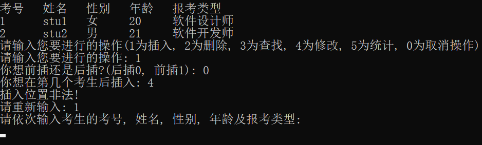 printf("你想在第几个考生"); printf(flag == BACK ? "后插入: " : "前插入: ");