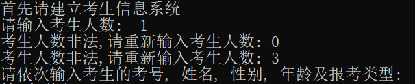 cout << "请依次输入考生的考号, 姓名, 性别, 年龄及报考类型: " << endl;