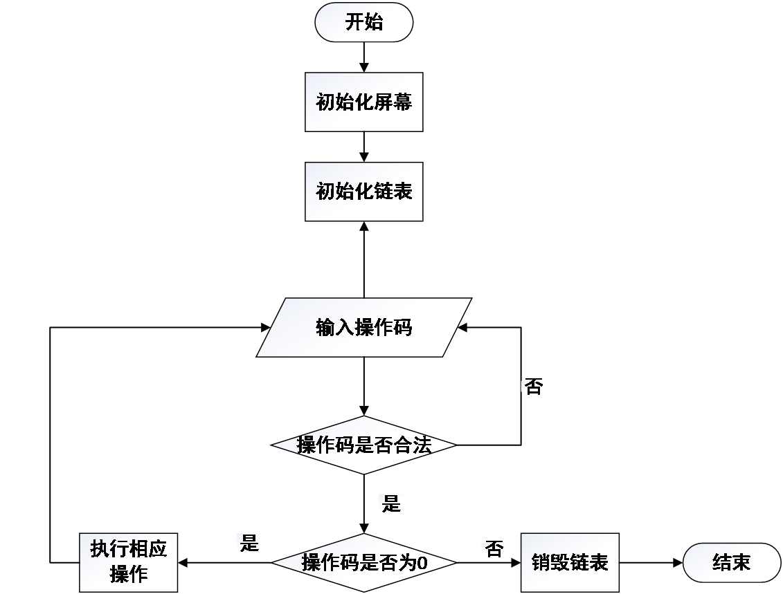 系统首先调用 StuSystem()函数实现对屏幕的初始化,完成对链表 list 的创建和输入数据工作,然后根据用户所输入的操作码(operatorCode)执行链表 list 对应的成员函数。