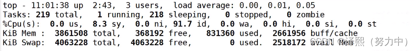 load average: 0.00, 0.01, 0.05 :系统的负载,三个数字分别1分钟 ,5分钟 ,15分钟内系统处理的任务数的平均值。
