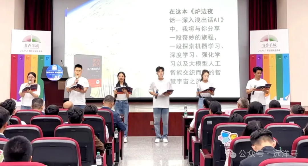 我的书《炉边夜话——深入浅出话AI》一书,成为活动启动仪式重点推荐图书。活动伊始,6名交通运输系统青年代表上台领读《炉边夜话——深入浅出话AI》书籍中的精选片段,用朗朗书声介绍书籍的内容脉络,通过背景补充、逻辑梳理和重点解读,吸引大家走进 AI 的奇妙世界。