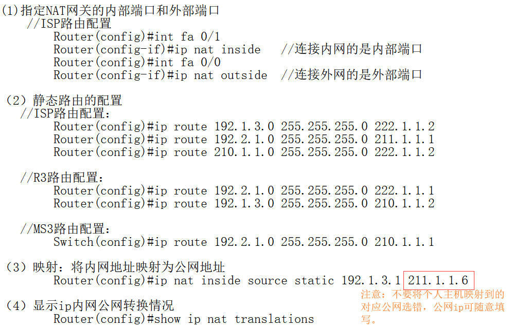 1.静态NAT的实现分为三个步骤(以下代码的实现都是根据上图的ip及端口号):