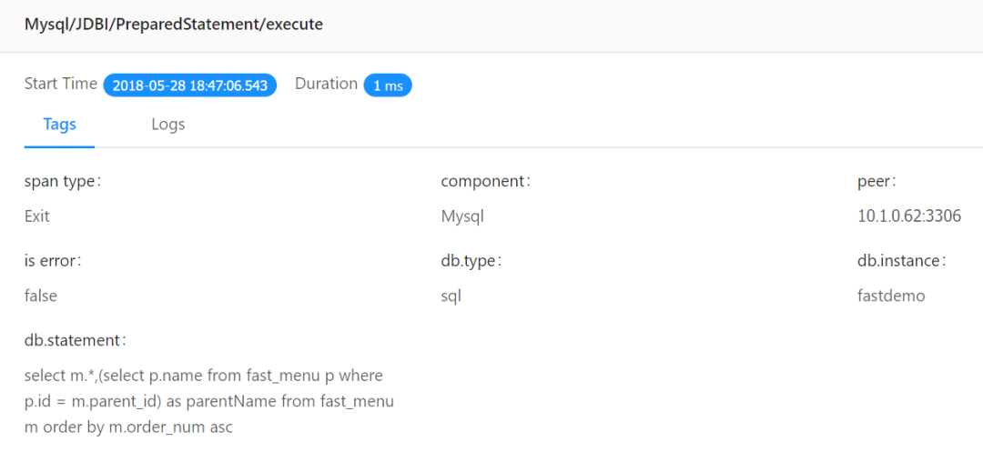 可以看到各span的耗时、异常和其他信息(不同的span支持不同的信息,例如DB类型的,可以打印出sql)