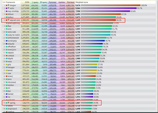 TechEmpower第19轮编程语言框架性能排行榜2020年5月28日正式发布,详见官方博客:https://www.techempower.com/blog/2020/05/28/framework-benchmarks-round-19/,asp.net core排第6名,asp.net 排名倒数第二,第103名, 微软几乎是从倒数一路逆袭到第一(注:主流Web开发框架)。
