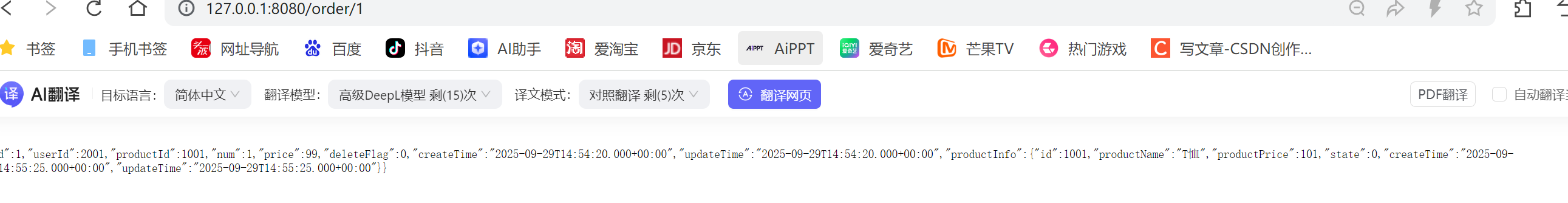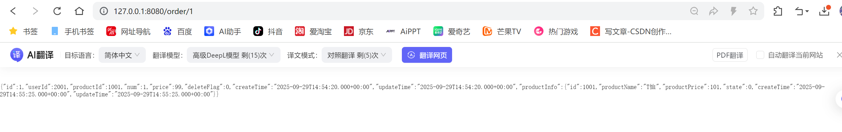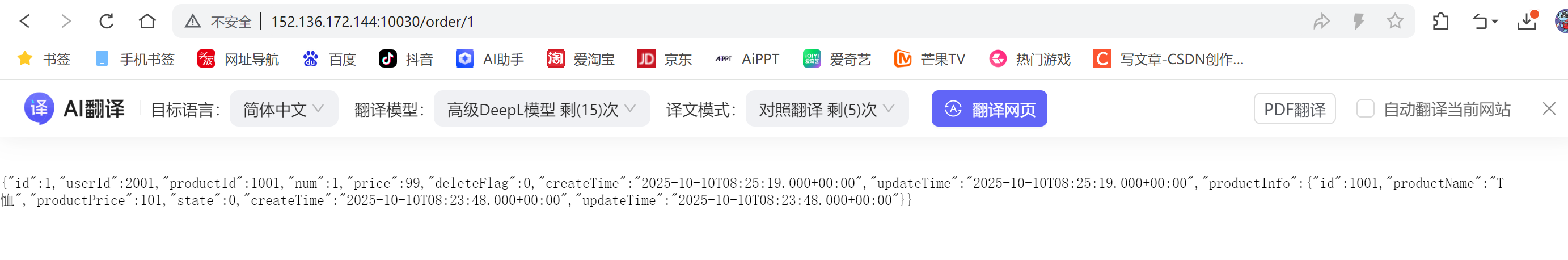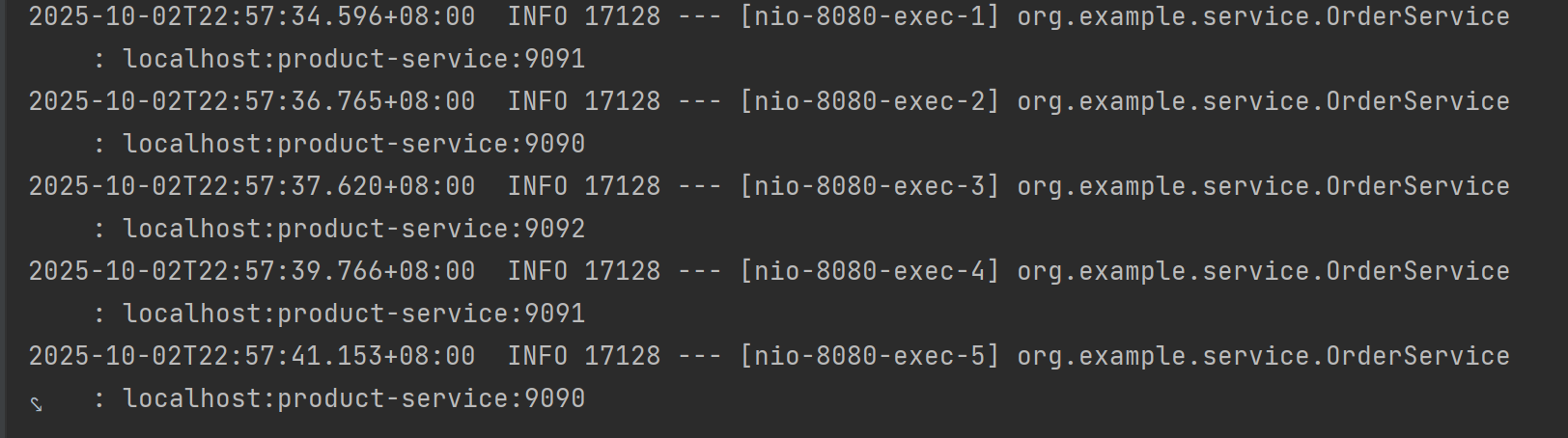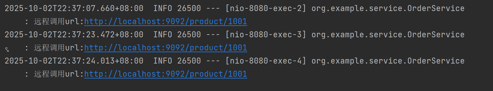 测试,重启服务, 访问接⼝, 观察⽇志 http://127.0.0.1:10030/order/1