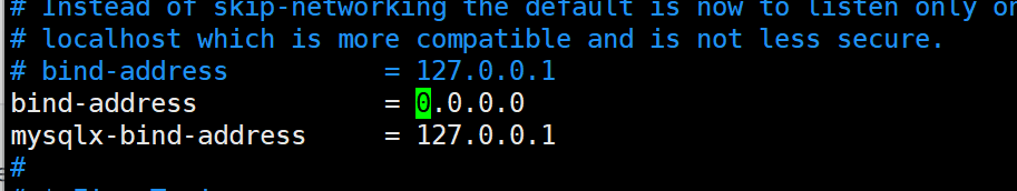 修改⽂件路径: /etc/mysql/mysql.conf.d/mysqld.cnf 把bind-address = 127.0.0.1改为 bind-address = 0.0.0.0
