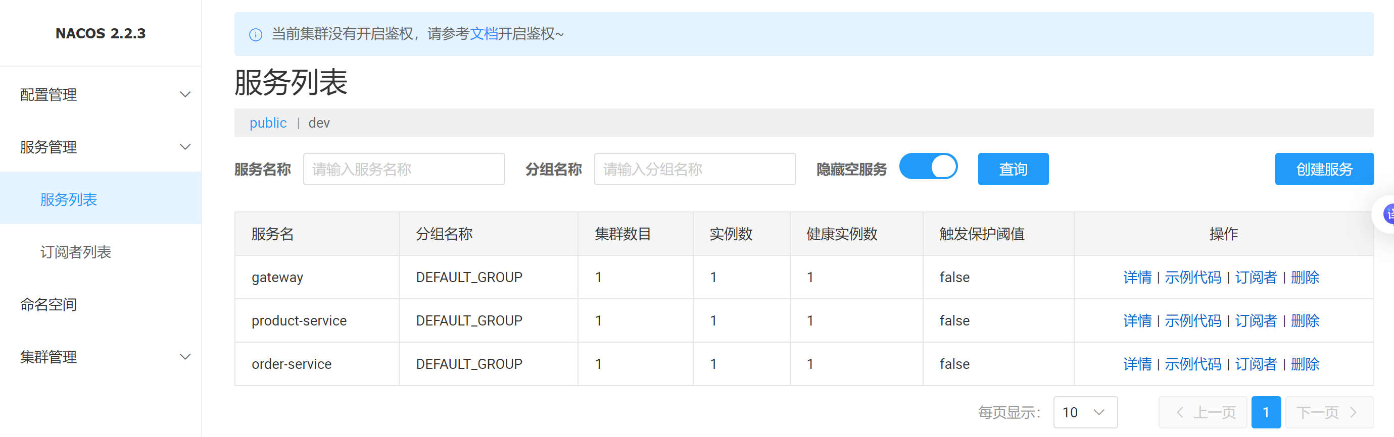 由于服务器受限, 我们把MySQL, Nacos, 理论上这两个服务是集群的模式,⽹关服务部署为单例的, 产品服务和订单服务部署为多例的.