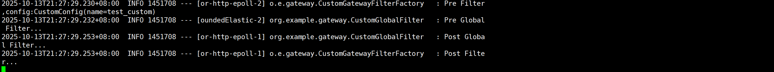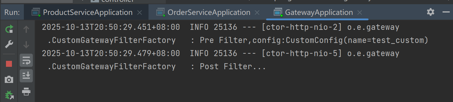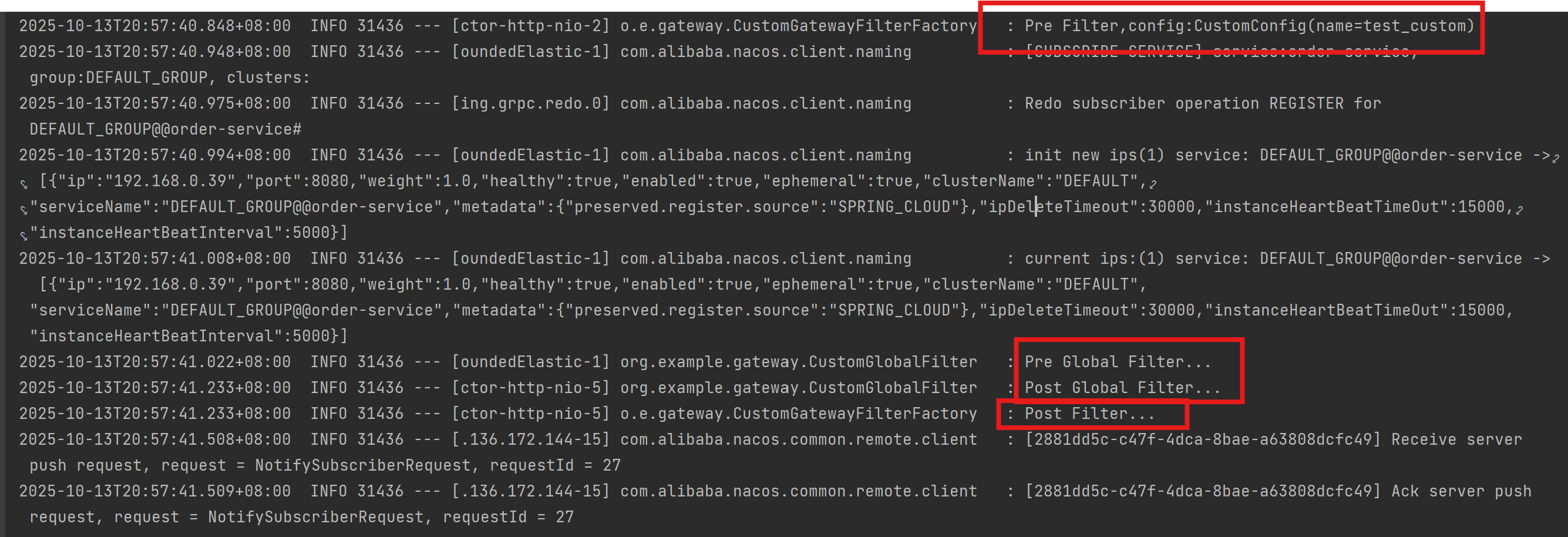 从⽇志中,也可以看出来, Pre过滤器:当GatewayFilter 和GlobalFilter 过滤器order⼀样时, 会先执⾏GatewayFilter,Post则反之